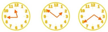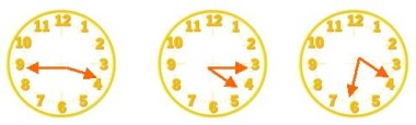 En el tercer reloj podemos leer: 3 y 40 o 4 menos 20, porque faltan 20 minutos para las 4 en punto.