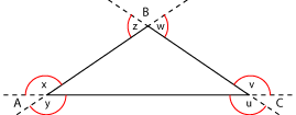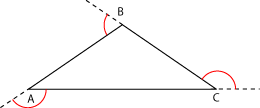 Los ángulos exteriores son aquellos que se forman entre un lado y la prolongación de otro. Por ejemplo: (ver figura a la derecha) |