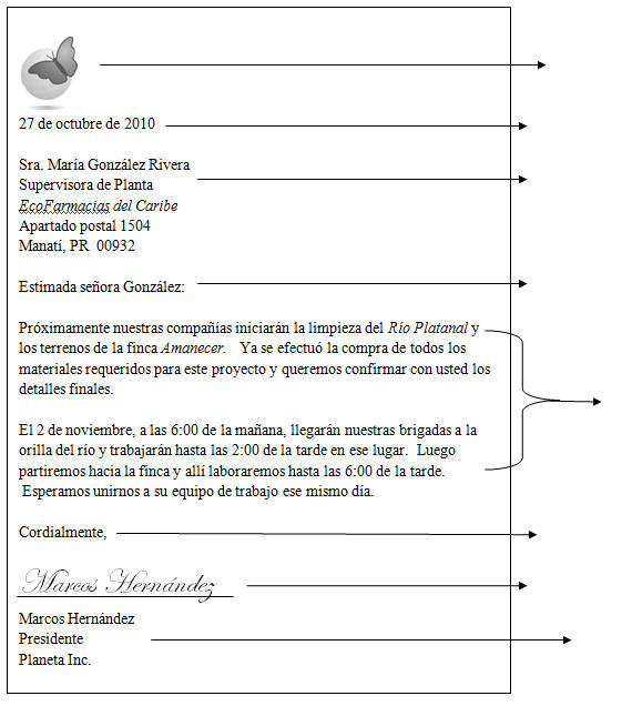 En la sección anterior leíste el cuento titulado La carta. Ahora, utiliza las palabras a continuación para identificar las partes de una carta formal: cuerpo, destinatario, remitente, logotipo, firma, despedida, fecha, saludo.