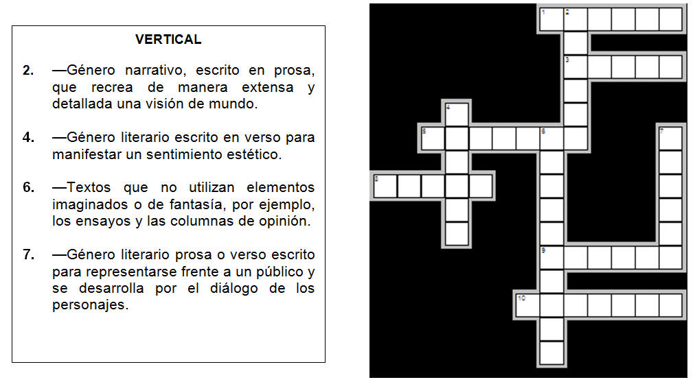 Horizontal 1. Género literario, escrito en prosa, que intenta exponer las ideas y comentarios del autor sin entrar en detalles eruditos. 3. Cada una de las líneas de un poema. Forma de escribir considerando, entre otras, la rima, el ritmo y musicalidad de las palabras. 5. En periodismo, tipo de ensayo o texto de opinión escrito por personas que colaboran con el periódico o revista. 8. Forma habitual de hablar o escribir sin preocuparse por la rima o el ritmo de las ideas 9. Género narrativo, escrito en prosa, generalmente breve. 10. Textos que utilizan elementos imaginados o fantasiosos. Es el caso de la mayoría de los cuentos, novelas y obras teatrales.