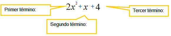 Práctica dirigida: Observa la siguiente expresión. ¿Cuántos términos tiene? Esta expresión tiene tres (3) términos (los términos están separados por una suma o resta). Una de las clasificaciones de los polinomios es por la cantidad de términos. Si la expresión tiene dos términos se conoce como binomio. Si tiene tres términos se conoce como trinomio. Sin embargo a nivel general, el concepto polinomio se asigna a las expresiones con dos términos o más. En este ejemplo, los términos del trinomio son: