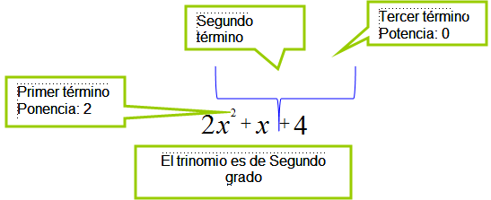 Por lo tanto, la segunda clasificación de los polinomios es el grado del mismo. El grado del polinomio se otorga de acuerdo al grado mayor de los términos. El grado de los términos y del siguiente trinomio son: