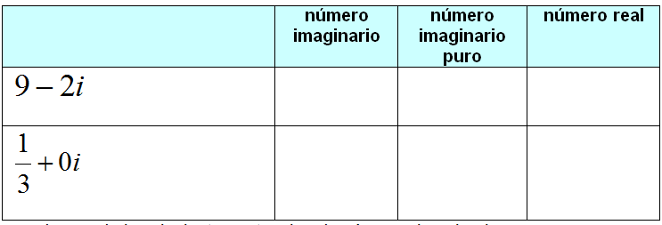 Práctica: Observa la siguiente tabla y clasifica los números en número imaginario, número imaginario puro o número real. Haz una X en la columna que aplique.