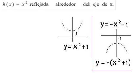 El otro tipo de transformación  que se da en las funciones es la reflexión.  Esta reflexión  se da alrededor de los ejes de x  ó  y.    Nota: Pueden ocurrir traslaciones y  reflexiones a la misma vez.