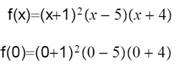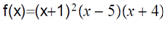 Halle los intercepto en x y y de f. Los intercepto en x (ceros) son (1, 0), (5,0), y (4,0) Para hallarlos en y, evalúe f (0). Por lo tanto, el intercepto en y es (0,20)
