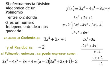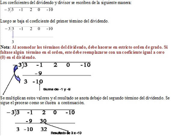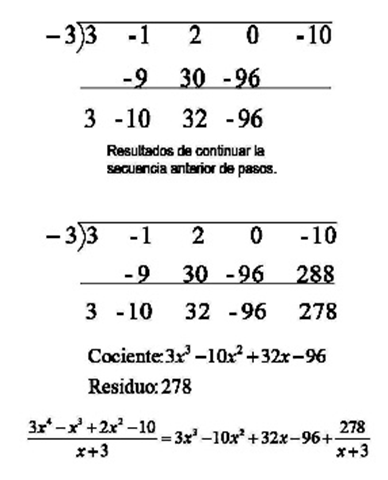 Como ves, los números que resultan son los coeficientes del polinomio resultante o cociente. Recuerda que este polinomio tiene un grado menos que el polinomio original. De ahí que el resultado sea el que observas.