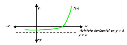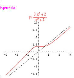 Es una recta a la cuál tiende a acercarse la función pero en la mayoría de los casos no la corta ni la toca. Existen asíntotas horizontales, verticales y oblicuas. Asíntota Horizontal es una recta horizontal a la que tiende a acercarse la función. Cada vez que la variable independiente (x) adquiere o toma valores más grandes y la variable dependiente (y) tiende a acercarse a un número, podemos decir que existe una asíntota horizontal en dicho número. Asíntota Vertical es una recta vertical a la que tiende a acercarse la función. Cuando la variable independiente tiende a acercarse a un número por derecha o por izquierda, es decir con valores mayores y con valores menores a dicho número, y la variable dependiente tiende a tomar valores muy grandes o muy pequeños, se dice que hay una asíntota vertical.