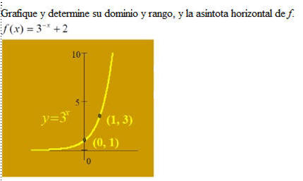 El dominio de la función exponencial está formada por el conjunto de los números reales y su recorrido está representado por el conjunto de los números positivos. Resumen de las características de