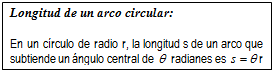 Ejemplo: Un ángulo central en un círculo de radio igual a 4m está subtendido por un arco de longitud igual a 6m. Obtenga la medida de en radianes.