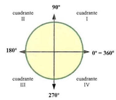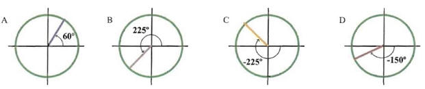 Decimos que un ángulo está en posición ordinaria o estándar cuando su vértice es el origen de un sistema de coordenadas rectangulares cartesianas y su lado inicial es la parte positiva del eje de abscisas. ![]() En los diagramas C y 0 se ilustran los ángulos con medidas de -225° (Lado terminal en el cuadrante II) y -150° (Lado terminal en el cuadrante III).