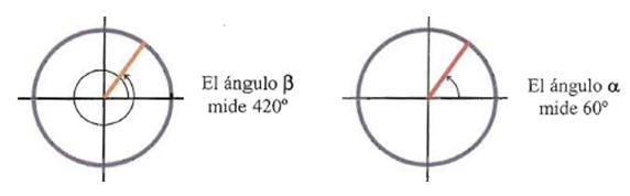 Si un ángulo mide m grados entonces la parte entera de la fracción m/360 es igual al numero de vueltas que el lado terminal da, en contra 0 a favor de las manecillas del reloj, dependiendo del signo de m ![]() Dos ángulos cuyos lados terminales coinciden, se conocen como ángulos coterminales. Luego, la medida de dos ángulos coterminales diferentes en múltiplos de 360° si está medido en grados o múltiplos de 2 si la medida es en radianes. Los ángulos cuyos lados terminales coinciden en el mismo lugar aunque no tengan las mismas medidas, se dice que son ángulos coterminales.