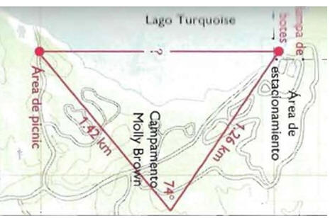 2-Halla la distancia desde el área de picnic hasta la rampa de botes al otro lado del LagoTurquoise. Utiliza la Ley del Coseno para resolver el problema.