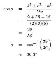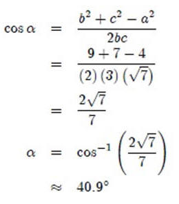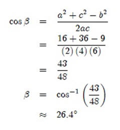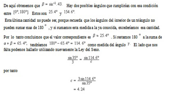 Recuerda que la raíz negativa no podemos considerarla como una alternativa en estos casos debido a que estas cantidades representan medidas con dimensiones reales. Para hallar las medidas restantes podemos usar también la Ley de los Cosenos.