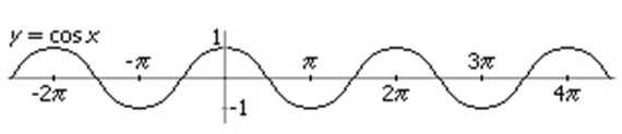 La función coseno es la función definida por: f(x)= cos x. Características1. Dominio: IR Recorrido: [-1, 1] 2. Es una función periódica, y su período es 2 π. 3. La función y=cos x es par, ya que cos(-x)=cos x, para todo x en IR. 4. La gráfica de y=cos x intercepta al eje X en los puntos cuyas abscisas son: x = π/2 + n π para todo número entero n. 5. El valor máximo de cos x es 1, y el valor mínimo valor es -1. La amplitud de la función y=cos x es 1.