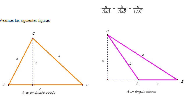 Cuando queremos resolver triángulos rectángulos recurrimos a las reglas trigonométricas tradicionales que sirven para esos propósitos. Sin embargo, cuando tratamos de resolver triángulos que no tienen ángulos rectos (oblicuos) necesitamos otras herramientas que nos permitan trabajar. Para resolver triángulos oblicuos, necesitamos conocer las medidas de al menos un lado y cualquieraotras dos partes del triángulo. Estas pueden ser dos lados, dos ángulos o un ángulo y un lado. Resumiendo el argumento anterior de una manera mas clara necesitaríamos tener una de las siguientes combinaciones para trabajar. · Dos ángulos y un lado (AAL ó ALA) · Dos lados y un ángulo opuesto a ellos (LLA) · Tres lados (LLL) · Dos lados y el ángulo incluido (LAL) Los primeros dos casos de nuestra lista se pueden resolver con la Ley del Seno. Veamos en que consiste nuestra ley. Si ABC es un triángulo con lados entonces:
