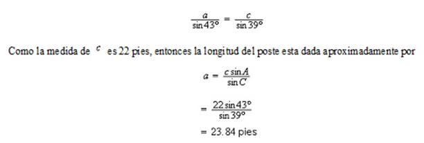 Ejemplo 2. Caso (ALA) Un poste se inclina ligeramente hacia el sol formando un ángulo de 8 con la vertical. Esto provoca que proyecte una sombra de 22 pies de largo. El ángulo de elevación desde la punta de la sombra hasta el tope del poste es de 43 . Diga cuál es la altura del poste.