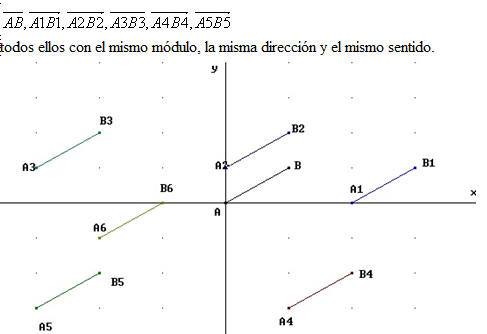 Los vectores libres que tienen igual módulo, misma dirección y sentido, son equivalentes. Sus rectas soportes son paralelas o coincidentes. Dos vectores fijos son equipolentes si tienen el mismo módulo, dirección y sentido. Para comprobarlo, se unen sus orígenes y sus extremos respectivos. Si el polígono resultante es un paralelogramo, los vectores son equipolentes.