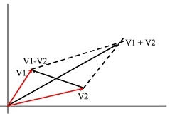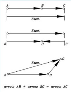 Ahora imagine que la ruta del piloto es hacia el este, pero un viento lateral sopla hacia el nordeste: ¿en que dirección se moverá el aeroplano y con que rapidez? La regla general es que las velocidades combinadas hacen que el aeroplano se desplace en una hora al mismo punto que alcanzaría si se moviera primero con un movimiento y luego con el otro, actuando solos durante una hora. Como se espera, la dirección es alguna entre la dirección este y la norte. Todos los vectores se pueden sumar entre ellos de esta manera, como flechas, uniendo la cabeza de uno a la cola del otro. Existe un método alternativo, con frecuencia más fácil de usar y que se describe a continuación.