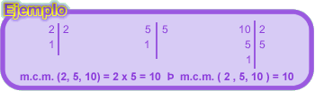 | Observa otro ejemplo: Calcular el mínimo común múltiplo entre los números 2, 5 y 10. |