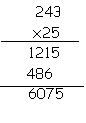 3) Luego se multiplica 2 por 243, es decir la decena del multiplicador; por cada uno de los números del multiplicando. El resultado se coloca debajo del 1215, pero cuidando de que coloquemos la primera cifra debajo de la decena. |