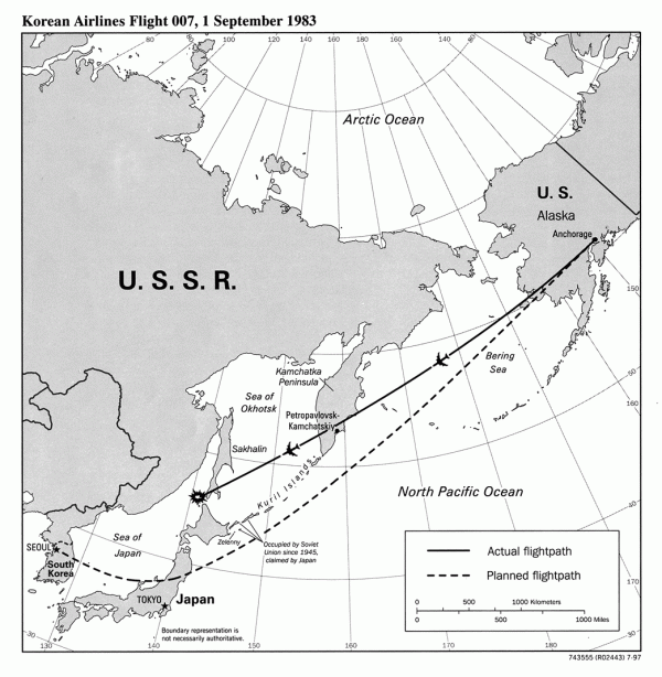 En enero de 1983 un caza ruso SU-15 derriba con misiles al vuelo 007 con 269 ocupantes al ingresar sospechosamente por error en espacio aereo de la Unión Soviética cerca de una base secreta en la isla de Sakhalin ante la sospecha de que esta realizando una mision de espionaje encubierta.