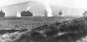 terrizaje de Puerto Argentino. Poco despues las primeras fragatas británicas cañonean las defensas de la capital