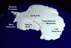 Mapa del continente con detalle de accidentes geograficos destacados, en particular formaciones montañosas, costas y barreras de hielos.