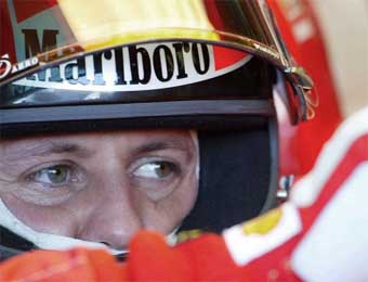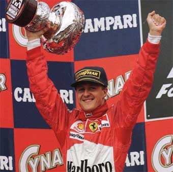 En 1995 repitió triunfo con Benetton y un año más tarde fichó por Ferrari con el objetivo de relanzar el palmarés de la mítica marca italiana. Estuvo durante cuatro años a punto de lograr el triunfo, pero por una serie de razones (entre ellas un accidente en 1999 en el que se fracturó las dos piernas) tuvo que resignarse a acumular victorias parciales hasta el año 2000, temporada en la que se proclamó campeón del mundo, algo que no lograba Ferrari desde 1979. En 2001 no sólo ganó nuevamente el campeonato, sino que obtuvo su victoria número 52 en Grandes Premios y batió el récord que hasta entonces ostentaba el piloto francés Alain Prost. De forma unánime, Schumi logró el reconocimiento internacional como mejor piloto de la historia, una auténtica leyenda situada a un peldaño del histórico Fangio, el piloto argentino que en la década de los cincuenta fue cinco veces campeón del mundo; una gesta sólo al alcance del "Barón Rojo" de la Fórmula 1. Camino de emular a Fangio, Schumacher comenzó el Campeonato del Mundo 2002 con una clara victoria en el G.P. de Australia, la número 54 de su cuenta particular y la tercera consecutiva en el circuito de Melbourne. Después sólo necesitó disputar diez pruebas más, en las que logró otras siete victorias (Brasil, San Marino, España, Austria, Canadá, Gran Bretaña, Francia), dos segundos puestos (Mónaco, Europa) y un tercero (Malaisia), para proclamarse pentacampeón mundial. Igualó así el récord de Fangio pero además logró el título a seis pruebas del final del campeonato y arrebató a Nigel Mansell la marca conquistada en 1992 cuando el británico fue campeón a falta de cinco carreras. El arranque del Mundial 2003 resultó más irregular de lo esperado para el piloto alemán que no logró subir al podio en los dos primeros G.P. del año y, en el tercero, abandonó el circuito; una circunstancia que no protagonizaba desde muchas carreras atrás. Todo cambió en San Marino, cuarta cita del campeonato, donde Schumi logró un triunfo especialmente emotivo pocas horas después de conocer el fallecimiento de su madre en Colonia. Con un golpe soberano de autoridad, también fue primero en Montmeló y en el G.P. de Austria y comenzó a fraguar la consecución de su sexta corona mundial. Volvió a subir a lo más alto del podio en Canadá y, pese a no demostrar la hegemonía de otras temporadas, el piloto de Ferrari se ocupó de puntuar en todos los G.P. para mantener la regularidad necesaria en todo aspirante al campeonato. Dos triunfos consecutivos en Italia y Estados Unidos colocaron a Schumi a un solo punto del título; una posición de privilegio para convertirse en el piloto más laureado de la historia. Todo debía dirimirse en el Gran Premio de Japón, última cita de la temporada, y en el circuito asiático el Barón Rojo cumplió su cometido: fue octavo y sumó a su casillero el punto que le otorgaba el sexto campeonato del mundo de su carrera; los cuatro últimos de manera consecutiva. El 29 de agosto de 2004 sumó un nuevo título mundial a su palmarés, el séptimo, a falta de cuatro pruebas, tras lograr el segundo puesto en el Campeonato de Bélgica, por detrás de Raikkonen. Con un inicio fulgurante, con victoria en las cinco primeras pruebas, Schumacher sumó un total de trece victorias (Australia, Malaisia, Bahrein, San Marino, Montmeló, Nürburgring, Canadá, EE.UU., Francia, Gran Bretaña, Alemania, Bélgica y Japón) y 148 puntos, 34 por encima del segundo clasificado, Barrichello. Destacan además sus nueve poles, marcas todas que acreditan un excelente año y que encumbran aún más al piloto de Hürt-Hermülheim como uno de los mejores pilotos de todos los tiempos. Polémico y disciplinado Si como piloto es un dechado de virtudes, a nivel humano su comportamiento está envuelto en la polémica. Siempre alegre y extravertido, parece más un latino que un germano, pero su engreimiento y su carácter altivo le ha perjudicado en sus relaciones con sus colegas de profesión e incluso con los periodistas alemanes. Le robó la novia, Corinna, a su amigo Heinz-Harald Frentzen, otro prometedor piloto de la nueva escuela alemana; no da un paso si no hay dinero por delante, y es extremadamente exigente con su imagen externa, hasta el punto que en una ocasión solicitó cuatro monos distintos y ninguno le satisfizo porque apreciaba alguna pequeña arruga.