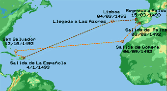 La expedición partió del puerto de Palos el 3 de agosto de 1492. Pese a la oposición de Martín Alonso y las dudas de Juan de la Cosa, Colón insistió obcecadamente en mantener el derrotero que marcaba el grado 28 de latitud, que pasaba por la isla de Hierro. Por fortuna, intuición o saberes que el Almirante no reveló, ese rumbo se mostraba muy favorable para avanzar sin zozobra hacia el poniente. Y la pequeña escuadra se internó en el enigma del «Mar Tenebroso». Pero pasaron más de dos meses sin avistar tierra y se produjeron conatos de rebelión, reducidos gracias a la autoridad indiscutida de Pinzón. Fue también el veterano piloto quien convenció a Colón finalmente de torcer el rumbo al sudoeste y pronto comenzaron a ver ramas flotantes, pájaros y otros signos inequívocos de que se acercaban a una costa (debe decirse que si hubieran seguido el derrotero del paralelo 28 hubieran llegado a la Florida, y quizá la historia de América hubiese sido otra). En la noche del 11 al 12 de octubre el marinero Juan Rodríguez Bermejo, apodado el Trianero, dio el grito de «¡Tierra!» desde la cofa de La Pinta. Al amanecer desembarcaron en una isla (Guananahí o Walting, en las Bahamas) que Colón bautizó San Salvador. Convencido de encontrarse en dominios del Gran Kan, el navegante recorrió el archipiélago en busca de riquezas. Pero sólo hallaron forestas tropicales y nativos desnudos. Luego de tocar la isla de Juana (Cuba), la Santa María encalló irremisiblemente en la costa de La Española (actual Haití). Colón decidió aprovechar los restos de la nave para construir un precario fuerte, que bautizó Natividad por ser 25 de diciembre. Quedaron allí unos pocos voluntarios y el resto de la expedición emprendió el regreso el 4 de enero de 1493. El Almirante capitaneaba La Niña y ordenó gobernar al norte, rumbo aparentemente erróneo. Pero una vez más acertó, pues la corriente del golfo lo enfiló sin dificultad hacia la península, mientras La Pinta de Martín Alonso era desviada por un temporal. Arribaron el uno a Lisboa y el otro a Bayona (Galicia). Y en tanto Colón rechazaba las ofertas de Juan II de Portugal para apropiarse del descubrimiento, Pinzón, enfermo, moría poco después.