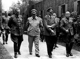 A fines de 1937 decidió reunir todos los países de lengua alemana antes de que las potencias occidentales acabasen de rearmarse. Ante la alarma del ala más conservadora del ejército, hostil a las SS, se deshizo de Blomberg, Von Neurath y destituyó al comandante en jefe de la Wehrmacht, Von Fritsch, acusándolo de homosexual, y al jefe del estado mayor Beck, asumiendo él mismo el mando. Seguro de la adhesión del Duce, en marzo de 1938 se apoderó de Austria. En septiembre, con el miedo a la guerra a su favor y el anticomunismo occidental, obtuvo la firma del Acuerdo de Munich, con lo cual ganó una cuarta parte de Checoslovaquia. El 15 de marzo de 1939, ya organizada la secesión eslovaca, puso bajo su protección a Bohemia-Moravia y ocupó Memel. A partir de abril reclamó los distritos alemanes de Polonia, reforzó su alianza con Italia mediante el Pacto de Acero del 22 de mayo y firmó el Pacto de Neutralidad germano-soviética. El 1 de septiembre invadió Polonia, desencadenando la Segunda Guerra Mundial. Adiós a Berlín La dominación de Hitler se extendió pronto por toda Europa. El 22 de junio de 1941 atacó la Unión Soviética y el fracaso frente a Moscú lo condujo a tomar él mismo el mando del ejército de tierra. Aún a fines de 1942 su empresa era exitosa. Ese año ya se había anunciado, aunque veladamente, la «solución final a la cuestión judía», y se sucedían los asesinatos masivos de judíos en toda Europa. En Polonia se acaban de construir nuevos campos: Auschwitz-Birkenau, Chelmno, Majdanek, Treblinka, Sobibor, Belzec. Incluidos los judíos rusos, los cálculos menos pesimistas estiman las víctimas en más de cuatro millones. El 10 de septiembre se había conseguido la expansión máxima de los alemanes en la Unión Soviética. La guerra se vio estancada y el adversario obligó a Alemania a defenderse. En noviembre las fuerzas aliadas desembarcaban en Marruecos y Argelia, y en enero de 1943 la Conferencia Angloamericana de Casablanca exigía la capitulación incondicional. Un mes después, el ejército alemán debía rendirse en Stalingrado. Goebbels declaró entonces la «guerra total». Durante los meses siguientes, sin embargo, el poder alemán fue decayendo abrumado por diferentes acontecimientos. En abril y mayo la resistencia se rebeló en el gueto de Varsovia y el Afrika-Korps italo-germano capituló en Túnez. En julio los aliados entraron en la fase de bombardeos masivos sobre Hamburgo y destruyeron gran parte de la ciudad; el día 10 los ingleses y norteamericanos desembarcaron en Sicilia y el 25 cayó Mussolini. Italia declaró entonces la guerra a Alemania. El 1 de diciembre Roosevelt, Churchill y Stalin, reunidos en la Conferencia de Teherán, plantearon la conveniencia de desmembrar Alemania. En junio de 1944 los aliados desembarcaron en Normandía.
