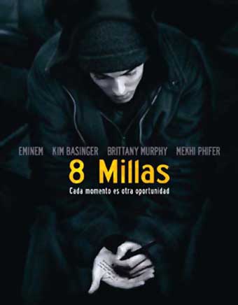 La única pelicula de Eminem hasta el momento es Ocho millas (8 mile, 2002). El filme es prácticamente un biopic sobre el manido tema de la superación personal, en el que los elementos ficticios se entreveran con los verídicos, procedentes de la biografía del propio Eminem. La acción de la película se sitúa en Detroit en 1995. Su título procede de del nombre de una calle, la 8 Mile Road, que delimita la frontera entre los barrios acomodados y los marginados. En estos últimos vive el protagonista, el joven Jimmy Smith Jr. (Eminem), que tiene su válvula de escape en el hip hop y en sus amigos: Future, con su carisma y su seguridad en si mismo; Sol, soñador y alegre; DJ Iz, concienciado, y Cheddar Bob. Jimmy y su grupo (los Three One Third) malviven de empleos de mala muerte y conviven con dificultad en una sociedad desalentadora.