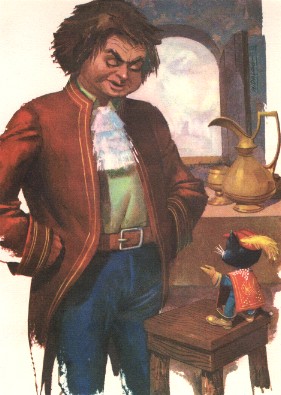 Inmediatamente fue a presentarlas al rey, como había hecho con el conejo, y el monarca recibió con tanto gusto las dos perdices que mandó a su tesorero diese al gato algún dinero para beber.