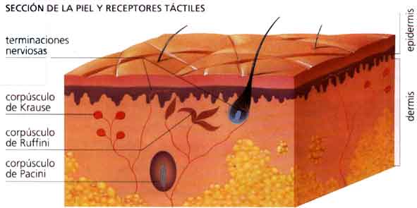 Corpúsculos de Vater-Pacini: están en la parte más profunda de la dermis y son sensibles alas deformaciones de la piel, es decir, a las fuerzas ejercidas sobre ella.