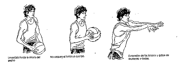 También existen distintos tipos de pases, un buen jugador tiene que saber cuando utilizar o uno u otro, Los pases que vamos a explicar son el de pecho, el picado, el de cabeza, y el de béisbol. El pase de pechoEste pase es el más seguro y fácil de hacer. Para realizarlo sacamos el balón a la altura del pecho con los brazo lo más pegado al cuerpo posible, después extendemos los brazos en línea recta y empujamos con las muñecas el balón pudiéndose que dar las manos con los dedos hacia abajo al igual que las palmas o hacia delante y las palmas hacia fuera. este movimiento de brazos lo acompañamos con un paso, de esta forma obtendremos más fuerza.