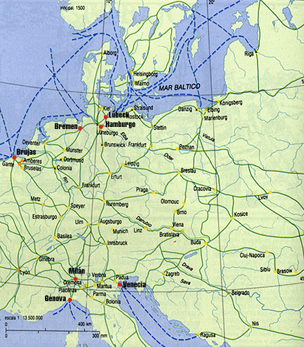 Las rutas comerciales en la Europa del norte. El comercio en el Báltico estaba dominado por la Liga Hanseática, confederación de más de 200 comunidades comerciales.