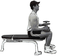 Siéntate en el borde de la banca y coloca una pesa sobre cada muslo. Levanta los talones. Lentamente baja y repite.