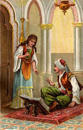Después de saludar al príncipe y a los jeques que charlaban en el salón, Beremiz, acompañado de una esclava, se encaminó hacia el aposento ya preparado para la lección.