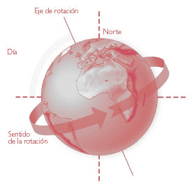 El movimiento de rotación de la Tierra se produce de Oeste a Este. Por eso, vemos aparecer el Sol por el Este y ocultarse por el Oeste. Aunque, en realidad, es la Tierra la que gira hacia ese lado.