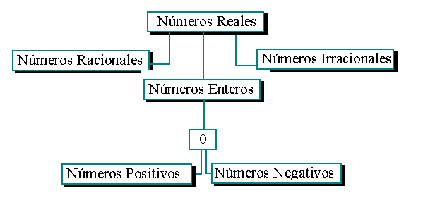 Los números reales se dividen en números racionales, números irracionales y números enteros los cuales a su vez se dividen en números negativos, números positivos y cero (0).