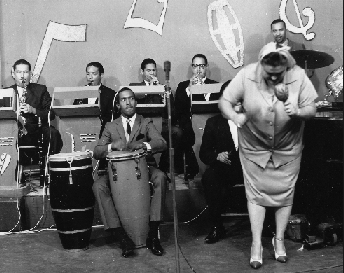 ejecutando la tumbadora, bongó, maracas, claves y timbales,