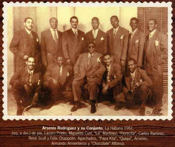 En el grupo que está de pie a la izq, Lázaro Prieto, bajista, miembro original del conjunto de Arsenio en Cuba. Abajo al centro Arsenio Rodríguez, a su lado derecho el sonero Rene Scull, (primo de Arsenio) dos espacios a su lado izquierdo le sigue Quique (hermano de Arsenio), el resto son todos boricuas (10).