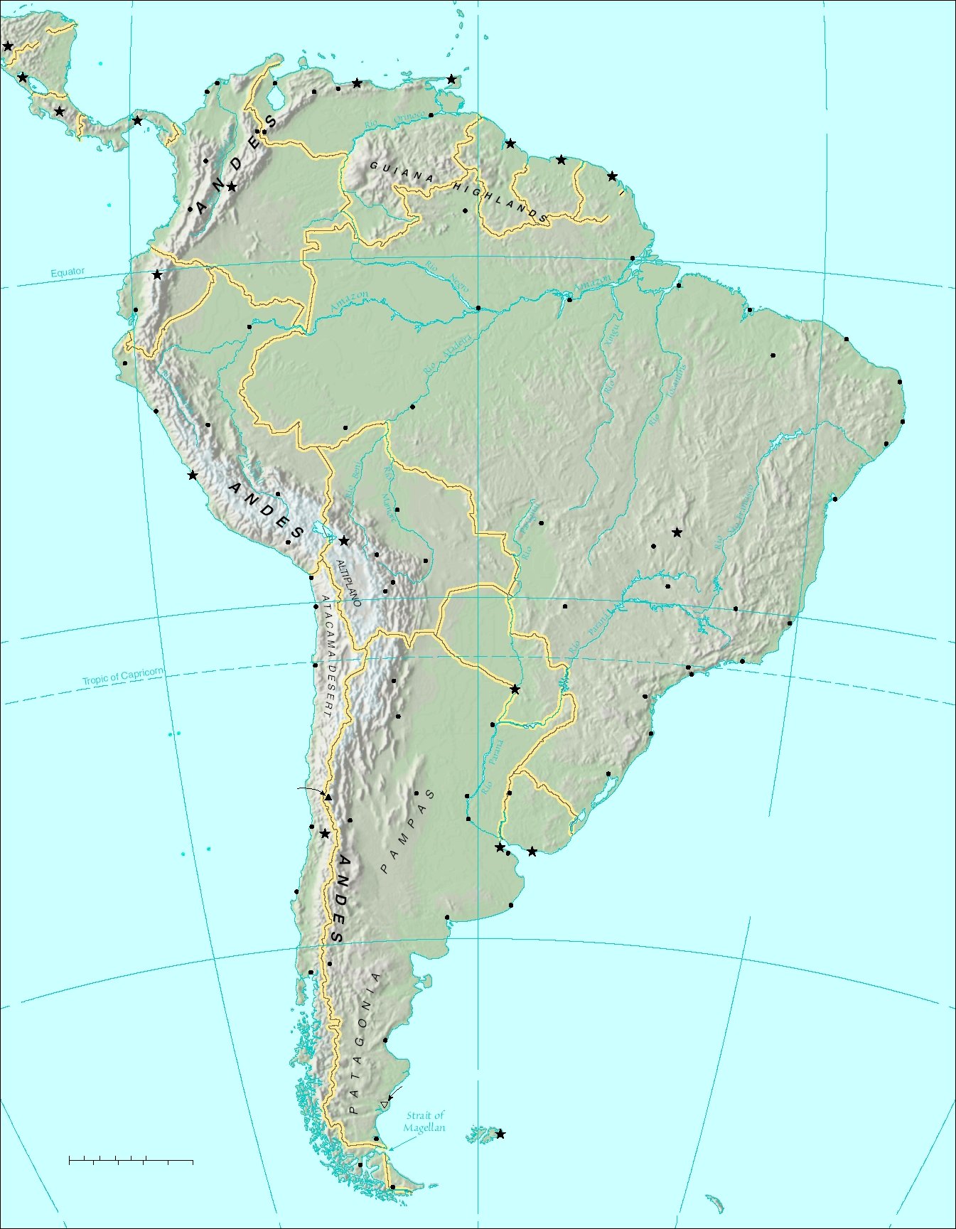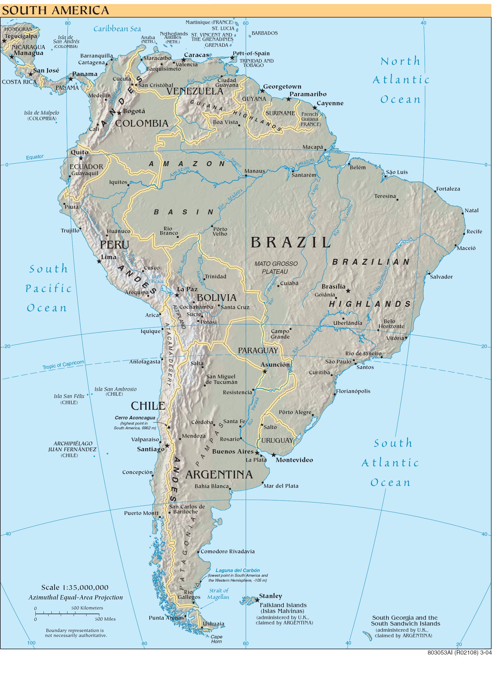 CHILE B R A Z I L URUGUAY PARAGUAY BOLIVIA COLOMBIA ECUADOR SURINAME PERU PANAMA NICARAGUA COSTA RICA HONDURAS TRINIDAD AND GUYANA BARBADOS (FRANCE) TOBAGO THE GRENADINES ST. LUCIA GRENADA Martinique VENEZUELA (CHILE) (CHILE) (CHILE) (COLOMBIA) (COLOMBIA) ST. VINCENT AND (FRANCE) French Guiana (NETH.) (NETH.) Aruba Antilles Netherlands Falkland Islands (Islas Malvinas) (administered by U.K., South Georgia and the South Sandwich Islands (administered by U.K., claimed by ARGENTINA) claimed by ARGENTINA) ARGENTINA 80 60 40 20 0 20 100 40 0 20 40 80 60 40 Lago Titicaca N o r t h A t l a n t i c O c e a n S o u t h A t l a n t i c O c e a n S o u t h P a c i f i c O c e a n Caribbean Sea Maracaibo Cali Guayaquil Recife Salvador São Paulo Rio de Janeiro Córdoba Rosario Pôrto Alegre Horizonte Antofagasta Concepción Puerto Montt Mendoza La Plata San Miguel de Tucumán Arica Santa Cruz Cochabamba Arequipa Manaus Natal Fortaleza Santarém Cusco Iquitos Trujillo Huánuco Piura Cartagena Barranquilla Ciudad Curitiba Teresina Ushuaia Punta Arenas Valparaíso Bahía Blanca Medellín Caracas Georgetown Paramaribo Cayenne Quito Lima La Paz Asunción Santiago Buenos Aires Montevideo Stanley Port-of-Spain Boa Vista Macapá Belém São Luís Velho Pôrto Branco Rio Goiânia Brasília Cúcuta Valencia Barquisimeto Río Gallegos Campo Grande Uberlândia Belo Salta Santa Fe Maceió Bogotá Panama San José Managua Tegucigalpa Santos Florianópolis San Cristóbal Guayana Vitória Iquique Resistencia Salto Sucre Potosí San Carlos de Bariloche Comodoro Rivadavia Cuiabá Trinidad Mar del Plata not necessarily authoritative. Azimuthal Equal-Area Projection Boundary representation is Scale 1:35,000,000 0 0 500 Miles 500 Kilometers 803053AI (R02108) 3-04 SOUTH AMERICA Cerro Aconcagua (highest point in South America, 6962 m) MATO GROSSO A M A Z O N B A S I N PLATEAU ARCHIPIÉLAGO JUAN FERNÁNDEZ B R A Z I L I A N H I G H L A N D S Isla San Félix Isla San Ambrosio Isla de Malpelo Isla de San Andrés Laguna del Carbón (lowest point in South America and the Western Hemisphere, -105 m) Cape Horn