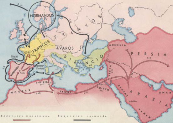 Después de la época de las invasiones germánicas, se desata sobre Europa un segundo período de inmigraciones de pueblos, aún más violentos que el primero. En realidad, estas invasiones son las que señalan el comienzo de la Edad Media, determinan la generalización de la economía agraria e imponen la organización feudal de la sociedad. Puede considerarse inaugurado este período con la expansión de los árabes en los siglos VII y VIII; su fin se halla, poco más o menos, al estabilizarse las incursiones de los normandos entre los siglos X y XI. En el mapa se aprecian con claridad los focos y las rutas de expansión de ambos movimientos. Educados por Mahoma en un nuevo ideal religioso y político, los árabes emprenden la conquista del Próximo Oriente, que logran en pocos años. Persia, Mesopotamia, Siria y Egipto caen en poder de los primeros califas. Después de una pausa, impuesta por la reorganización del Estado, los árabes llegan, por Occidente, hasta el corazón de Francia, a través del África Menor y España, que han conquistado; amenazan Constantinopla y penetran en Asia Central y la India. Nunca se vio hasta entonces imperio tan extenso como el del Califato musulmán. Los normandos partieron del sur de Escandinavia y Dinamarca. Por el Oeste llegaron hasta Groenlandia y América del Norte, a través del Atlántico; se establecieron en Normandía e Inglaterra y atacaron las costas de Francia y España. También actuaron en el Mediterráneo occidental, llegando hasta Sicilia y el Sur de Italia. por el Este, fundaron los estados rusovaregos en el curso del Dniéper.