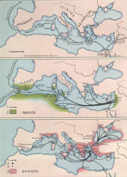 El Mediterráneo ha sido la cuna de la civilización occidental y escena de las expansiones históricas más notables en el transcurso de las épocas. Los tres gráficos señalan su importancia desde el comienzo de los tiempos históricos hasta el siglo V antes de Jesucristo. Las relaciones mediterráneas se anudaron mucho antes de la plena Edad del Bronce, pero sólo en este período las rutas comerciales toman consistencia, según se observa en la parte superior del mapa. En él se ven los principales centros de este comercio: Fenicia, Egipto, Creta, Sicilia y la remota España. Durante la primera mitad del primer milenio antes de Jesucristo se desarrollan en el Mediterráneo las colonizaciones fenicia y griega. Éste es uno de los hechos culturales y políticos de mayor trascendencia en la historia de la Antigüedad. Aunque en muchos casos se desarrollan simultáneamente, en general la colonización fenicia es más antigua que la griega. En el mapa A señalamos las rutas comerciales (signo número 1( y en el B el territorio ocupado o influido por los fenicios (signo número 2). Como se desprende del mismo, la expansión fenicia se realizó a partir de los emporios del litoral de Siria (Barilo, Sidón y Tiro) y tuvo su núcleo más importante en África Menor, islas del Mediterráneo central y occidental y sur de España (Tartesos). La parte inferior del mapa se refiere a la colonización griega, cuyos efectos fueron más duraderos que la de los fenicios. El signo número 1 indica las rutas de expansión helénica en el Mediterráneo; el 2, las grandes metrópolis, fundadoras de ciudades como Coreira, Corinto, Megara, Calcia, Focea, Éfeso y Mileto; el 3, las principales colonias griegas en el litoral mediterráneo, y el 4, los territorios con mayor influjo griego. Obsérvense, en particular, los grupos del mar Negro, Magna Grecia y sur de Francia.