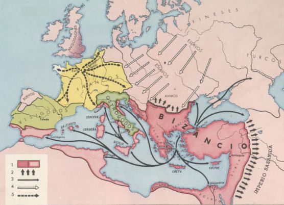 Nos hallamos ya en pleno siglo VI. Las oleadas bárbaras han sumergido por completo el antiguo imperio mediterráneo de Roma, salvo una porción en Oriente que se mantiene incólume: el Imperio bizantino. En esencia lo constituyen los Balcanes y Grecia, Asia Menor, Siria y Egipto, o sea una combinación afortunada de bastiones militares, feraces tierras agrícolas y grandes emporios comerciales. Este Imperio no sólo opuso tenaz resistencia a las invasiones germánicas y asiáticas (signo 2), sino que logró rehacerse, y bajo Justiniano incluso intentó la restauración imperial en Oriente (signo 1). En efecto, las tropas de este emperador se adueñaron del reino vándalo y de sus posesiones marítimas, arrebataron Italia al poder ostrogodo y se establecieron en el Mediodía de la península hispánica, aprovechando las luchas intestinas por la corona visigoda. Este esfuerzo militar fue acompañado por una activa irradiación comercial y económica (signo 3), al mismo tiempo que reverdecían las artes y el derecho. Los lombardos, quienes invadieron Italia, y el alud de los pueblos eslavos (signo 4), redujeron y comprometieron la obra de Justiniano. La restauración del imperio único mediterráneo se reveló imposible, tanto más cuanto existían grandes divergencias espirituales y religiosas entre Bizancio y Roma. Por otra parte, en Occidente aparecía una nueva gran potencia hegemónica: el reino franco, que desde sus núcleos en Reims, Soissons, Orleans y París, había irradiado en todas direcciones (signo 5), englobando toda la Galia, más Baviera y Turingia, en Alemania.