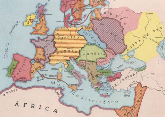 A mediados del siglo XIV, el mapa de Europa revela importantes modificaciones territoriales. En Occidente, continúa la división tradicional del archipiélago Británico en los tres estados de Escocia, Inglaterra e Irlanda. Sin embargo, la monarquía inglesa conserva una cabeza de puente en Irlanda y otra en Guyena, desde donde aspirará a imponer sus pretensiones al trono de Francia en la inminente guerra de los Cien Años. Por lo que respecta a la península hispánica, los cinco reinos en ella existentes han cobrado límites definitivos después de las grandes conquistas cristianas del siglo XIII. Castilla se ha convertido en el estado peninsular más extenso; pero Aragón desarrolla una gran política mediterránea: posee Baleares y Cerdeña y aspira al dominio de Sicilia, donde reina una dinastía de la Casa de Barcelona. Los límites del Imperio alemán, tan vastos, no corresponden a la realidad de su potencia, que mengua vertiginosamente a partir del Gran Interregno de fines del siglo XIII. Pronto veremos cómo su territorio merma a expensas de sus vecinos o de los nuevos estados que surgen en sus fronteras de Occidente. En el Báltico, Dinamarca hace de gran potencia, cuya hegemonía tendrá una ratificación política en la Unión de Kalmar. Mientras el ducado de Moscú apenas nace a la vida histórica, Polonia y Lituania, que unirán sus esfuerzos en el siglo XV, se convierten en el núcleo más poderoso de Oriente. En los Balcanes se asiste a la fugaz hegemonía de Servia, mientras Bizancio resiste a la desesperada en territorios cada vez más fragmentados y en Asia nace el temible poderío del Imperio otomano.