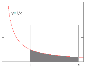 Otra forma de definir el número e es utilizando la gráfica y = 1/x. El área comprendida entre la gráfica y = 1/x, la recta x = 1 y x = e es igual a 1.