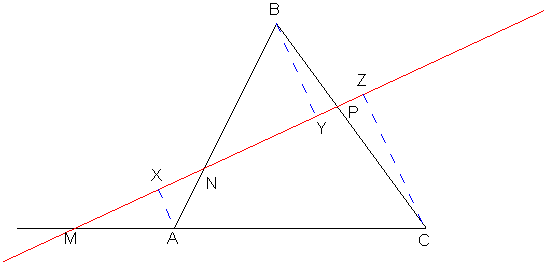 Tenemos un triángulo, y una recta (en rojo) que corta al triángulo en los puntos M, N y P. Trazamos perpendicualres desde los vértices del triángulo a la recta.