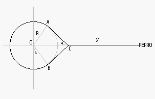 Sea y la distancia entre el perro y el nudo corredizo, x, la distancia entre el nudo corredizo y el punto en que la cuerda toca a la columna y a el ángulo que forma la cuerda con el eje de abscisas en C (el nudo).