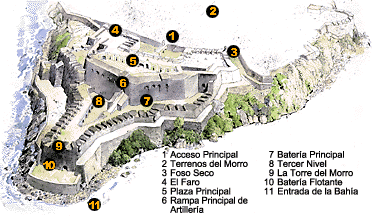 Castillo San Felipe del Morro: Esta Fortaleza se empezó a construir en el 1539 y duró alrededor de 350 años en su terminación, la cual rodeaba totalmente la ciudad. Constaba de 4 puertas de acceso a la ciudad. Es un laberinto de túneles, mazmorras, barracas, puestos de guardias, y rampas.